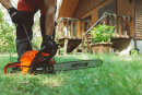 • Univerzální pila s výkonným motorem, lehkou lištou, bočním napínáním řetězu, zachytávačem matek, ručně odnímatelným krytem filtru a průhlednou palivovou nádrží.