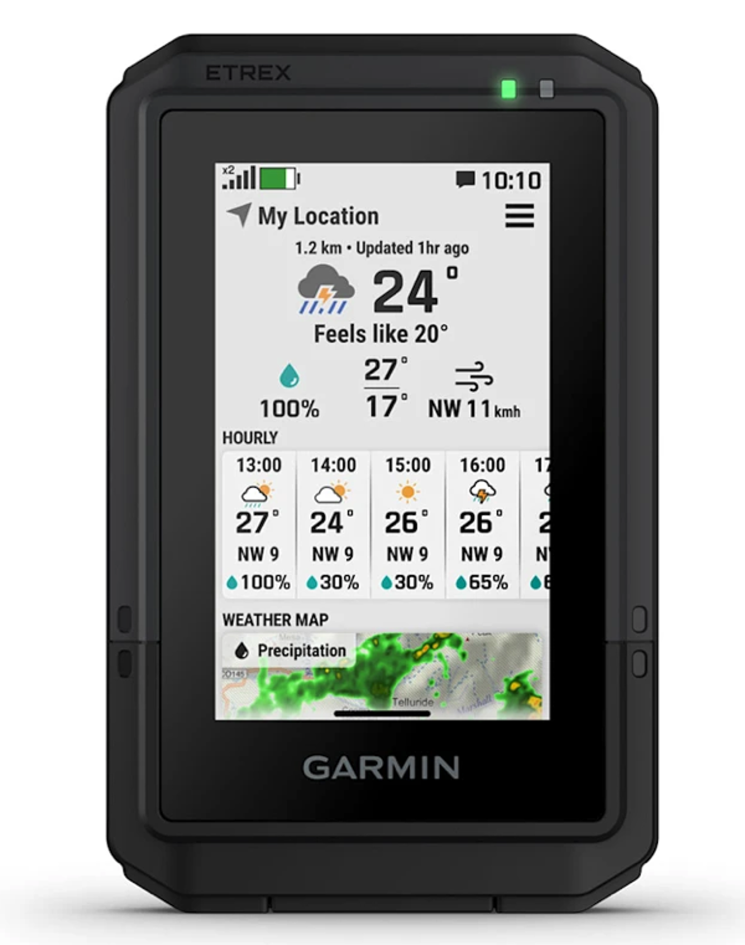 Získejte předpovědi počasí v reálném čase, abyste byli informováni o měnících se podmínkách. Funkce vyžaduje aktivní internetové připojení pomocí Wi-Fi nebo propojení s aplikací Garmin Explore na spárovaném telefonu.