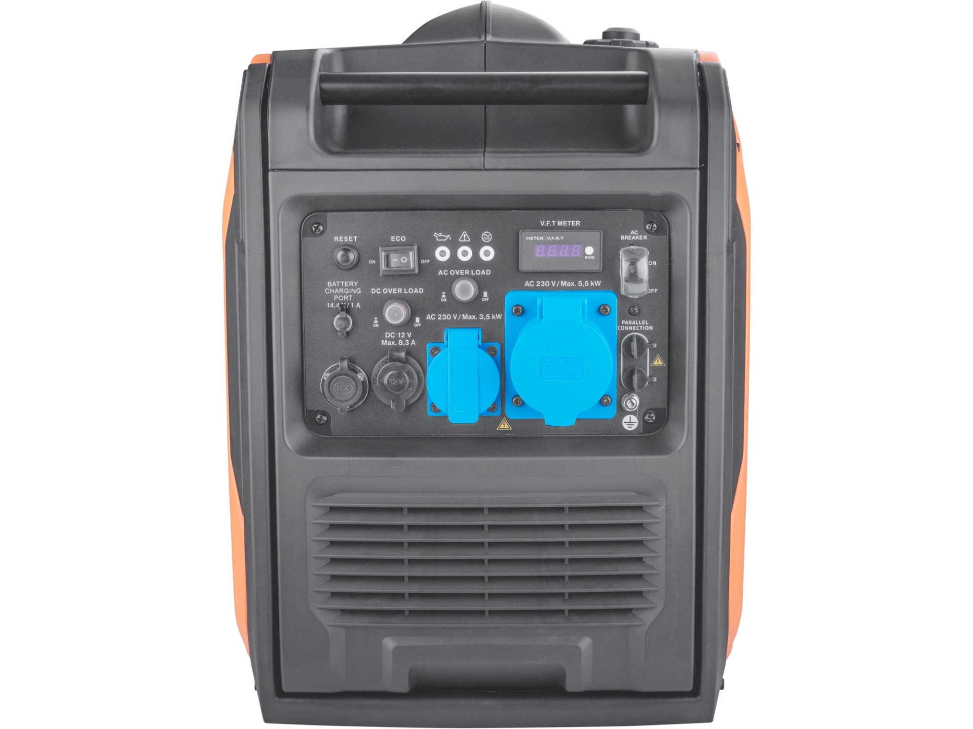 Díky své nízké hmotnosti, malým rozměrům, mimořádně tichému chodu a minimální spotřebě, jsou tyto digitální generátory ideálním zdrojem energie při rekreaci (chaty, karavany, lodě apod.) a na expedicích. Centrála je kompletně připravena pro použití v ATS režimu. Stačí ji jen zapojit k ATS jednotce (8898147) a může být jednoduše použita pro zálohování napájení. Dokonalá kvalita napětí, zajištěná invertorovým systémem vyhlazení výstupní křivky, však umožňuje jejich využití také pro napájení citlivé elektroniky, jako je výpočetní technika nebo lékařské vybavení. Díky funkci inteligentní regulace otáček v závislosti na spotřebě je tato digitální elektrocentrála až o 40% ekonomičtější oproti běžným elektrocentrálám. Navíc má možnost zapnout ekonomický režim provozu, kdy se sníží otáčky motoru, výkon, ale i spotřeba, což se hodí pokud nevyužíváte elektrocentrálu na plný výkon. Na panelu elektrocentrály je jedna 16A zásuvka a jedna 32A zásuvka s 230V, které umožňují připojit vysoko odběrové spotřebiče s celkovým špičkovým výkonem až 6,5kW. Dále je vybavena 12V auto zásuvkou se stejnosměrným proudem, která umožňuje použití různých 12V spotřebičů (např. USB nabíječka, kompresor, lednička, …). Součástí příslušenství jsou rovněž nabíjecí kabely, díky nimž lze elektrocentrálou dobíjet 12V autobaterie. Elektrocentrála je vybavena digitálním počítadlem celkových provozních hodin od prvního startu, provozních hodin od posledního startu, aktuálního napětí a frekvence. Díky elektrickému startu nastartujete a vypnete centrálu stiskem tlačítka jedním prstem. Tento start je zajišťován moderním Li-ion akumulátorem s dlouhou životností dobíjeným chodem elektrocentrály. Díky použité Li-ion technologii je akumulátor lehčí a lze ho kdykoliv dobíjet, aniž by se tím snižovala jeho kapacita. Akumulátor také ztrácí energii vlivem samovybíjení velmi pomalu a vydrží dlouho nabitý a připravený k použití. Funkce dálkového ovládání vám umožní nastartovat centrálu při optimálních podmínkách na vzdálenost až 100m. Pokud jsou mezi vámi a centrálou nějaké překážky, je nutné být blíže centrále. Dálkové ovládaní používá RF technologii. Velikost nádrže umožňuje až 5 hodin nepřetržitého provozu (v závislosti na zatížení). Centrála má integrované kolečka a rukojeť, které významně usnadňují její přepravu. K centrále lze dokoupit speciální propojovací kabel pomocí kterého může spojit dvě stejné centrály dohromady. Po jejich propojení dosáhnete provozního výkonu až 9kW.