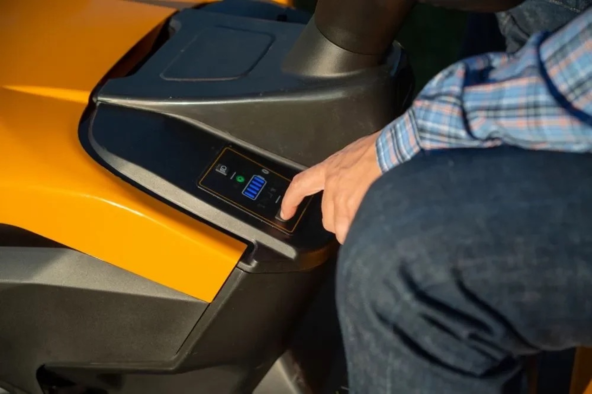 Plynulý elektrický pohon zadních kol ovládaný pedálem umožňuje velmi snadné řízení a přesné manévrování mezi stromy, keři i dalšími překážkami. Komfort při práci zvyšuje ergonomické sedadlo, přehledná palubní deska s LED kontrolkami a LED světlomety pro práci za horší viditelnosti.